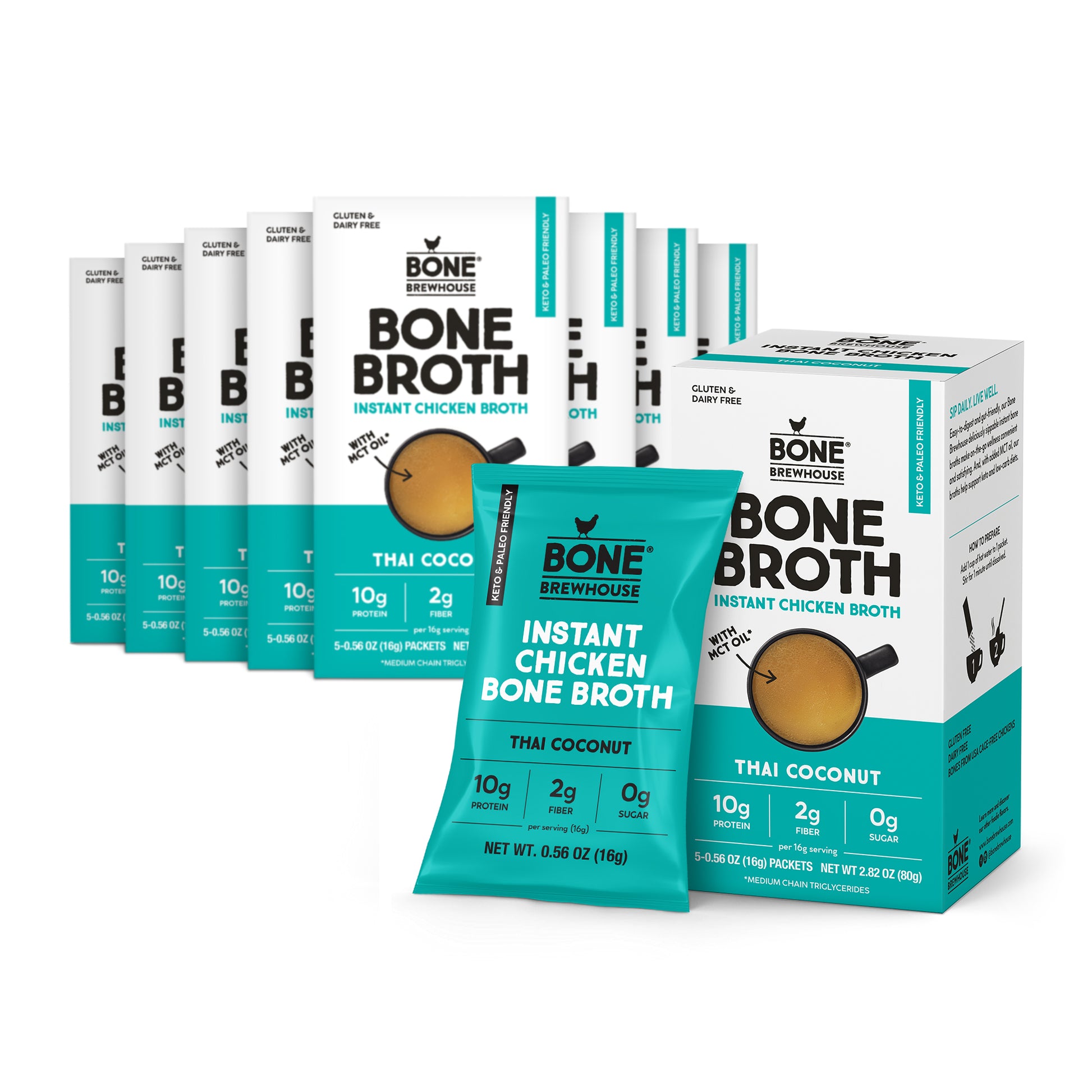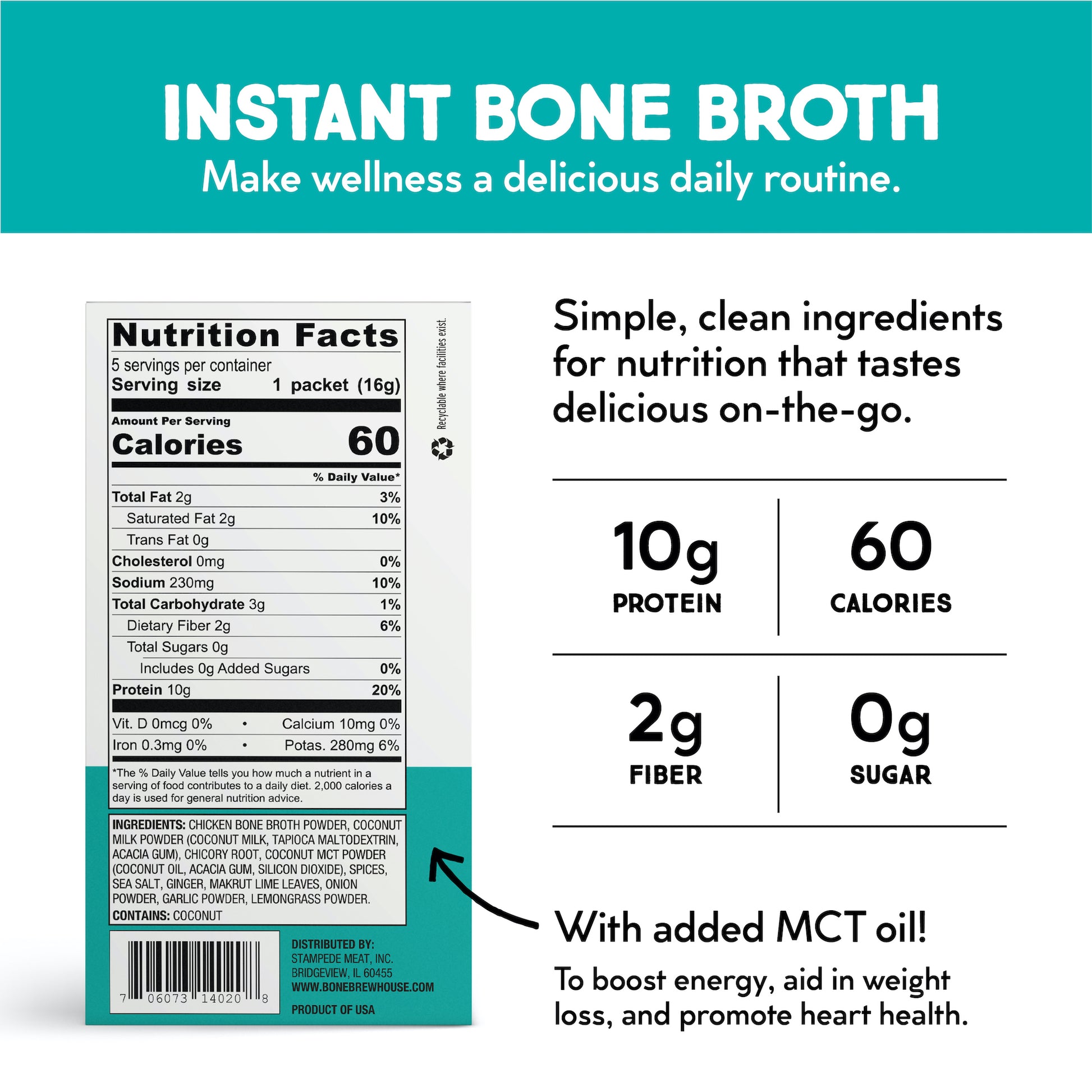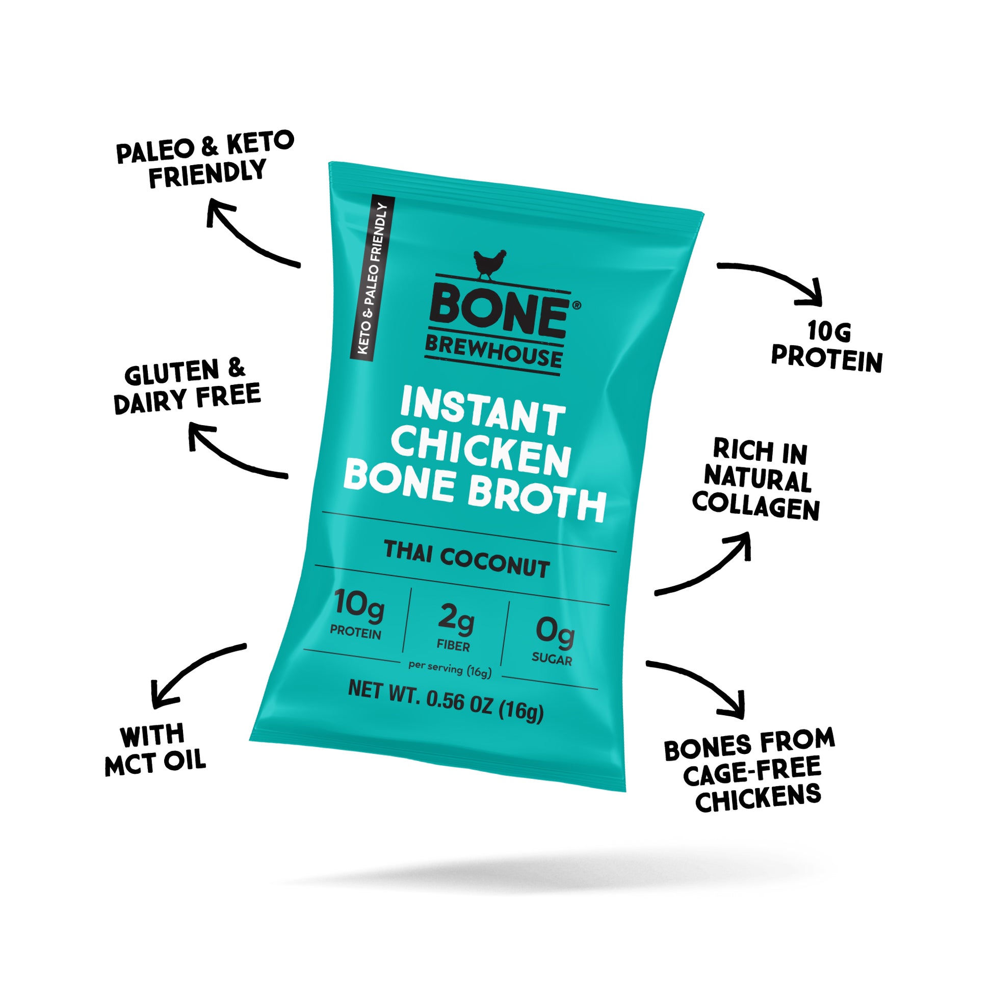 With this unique and delicious mix of savory ingredients, you’ll conquer bone broth boredom with our Thai Coconut Instant Chicken Bone Broth powder, while supporting good health. Open a packet, add a cup of hot water, stir, and enjoy. Or add to recipes like soups, rice, or meatballs.